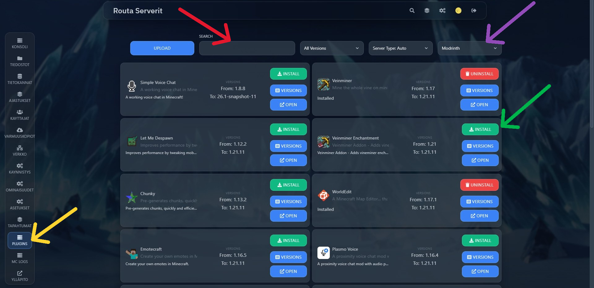 Seuraa näitä vaiheita asentaaksesi uusia laajennuksia (plugineita) palvelimellesi hallintapaneelin kautta:
